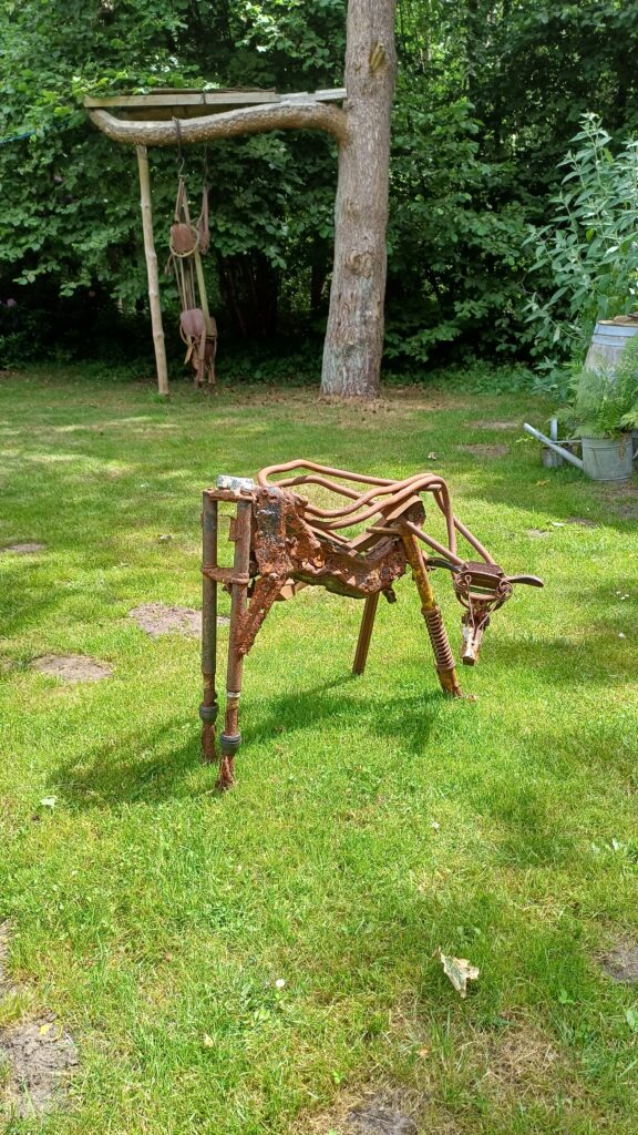 Marco Dijkstra (1971) is altijd een verzamelaar geweest. Toen hij een aantal jaar geleden zijn schuur met oud ijzer wilde opruimen kon hij het niet over zijn hart verkrijgen om alles zomaar weg te doen. Hij begon wat dingen bij elkaar te leggen en al snel werd er een haan geboren, gemaakt van oude harken en een heggenschaar. Van het een kwam het ander en zo ontstond zijn passie voor het maken van beelden van oude gereedschappen en andere verroeste ijzerwaren. Marco geeft oud gereedschap een nieuw leven en een totaal andere functie.