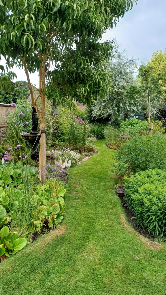 Het is een langgerekte tuin, verdeeld in drie tuinkamers, waardoor het geheel niet in één keer te overzien is.