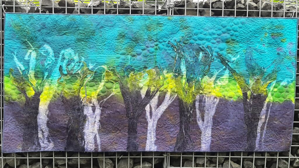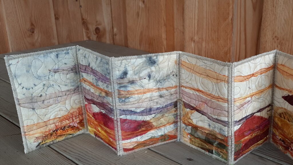 Delen van de geverfde lappen stof worden verwerkt in quilts, vaak met bloemenapplicaties, waar met de hand of naaimachine veel lijnen in genaaid worden om de vormen te benadrukken.