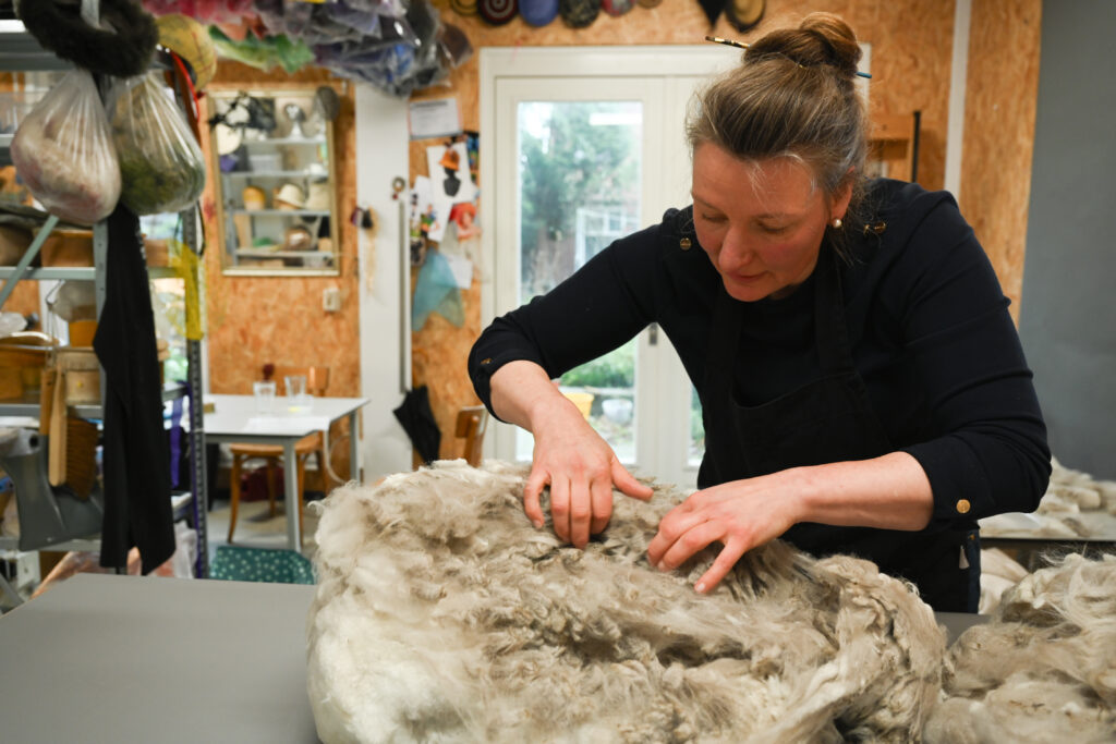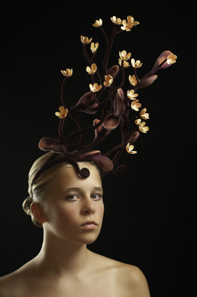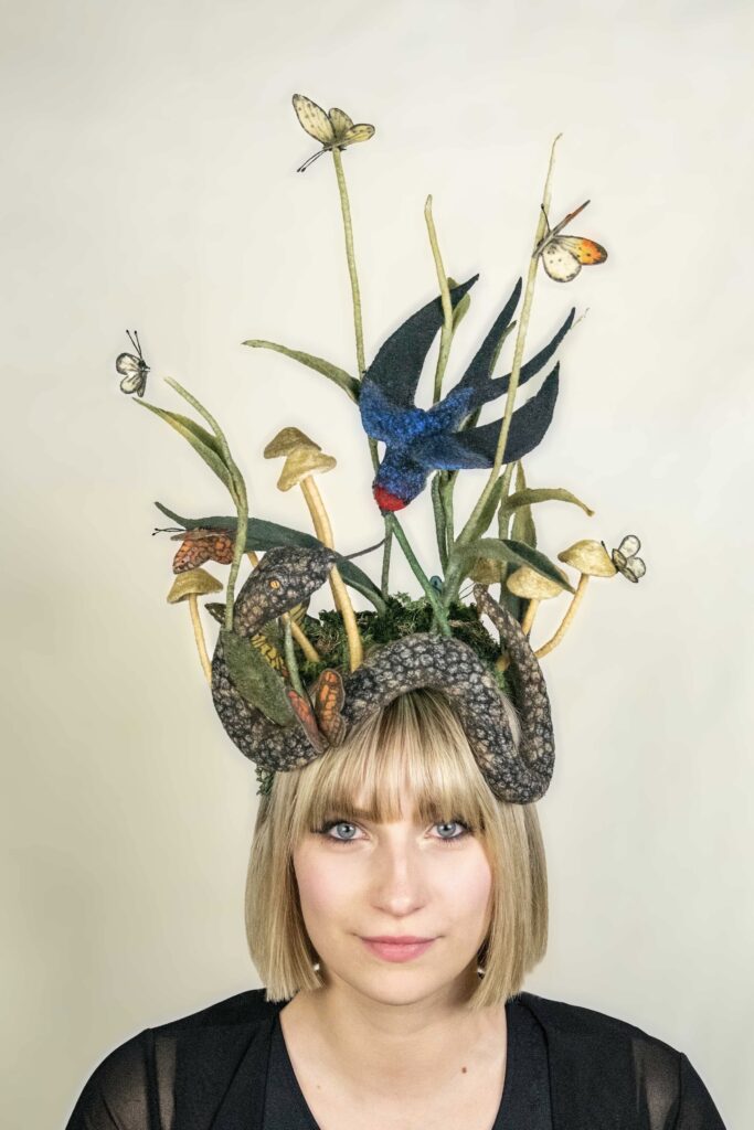 Saar Snoek (1974) werkt als vilt en hoedenmaker. Ze maakt vrolijke en wilde ontwerpen met veel kleur textuur. Haar werk bevindt zich op het grensvlak van mode en kunst en is geinspireerd door alles wat leeft. Saar heeft diverse internationale prijzen gewonnen en haar werk is wereldwijd opgenomen in museale en prive collecties Daarnaast geeft Saar ook workshops om haar passie voor het ambacht en techniek door te geven.